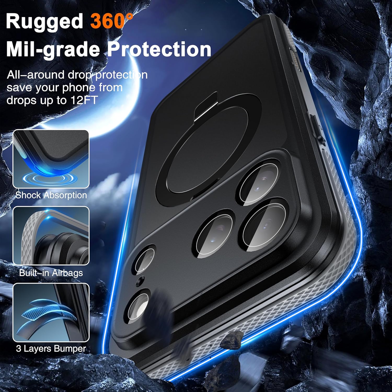 OAKTREE iPhone 17 Pro Max Waterproof MagSafe Case with Kickstand Ring - 360° Full Protection- Black