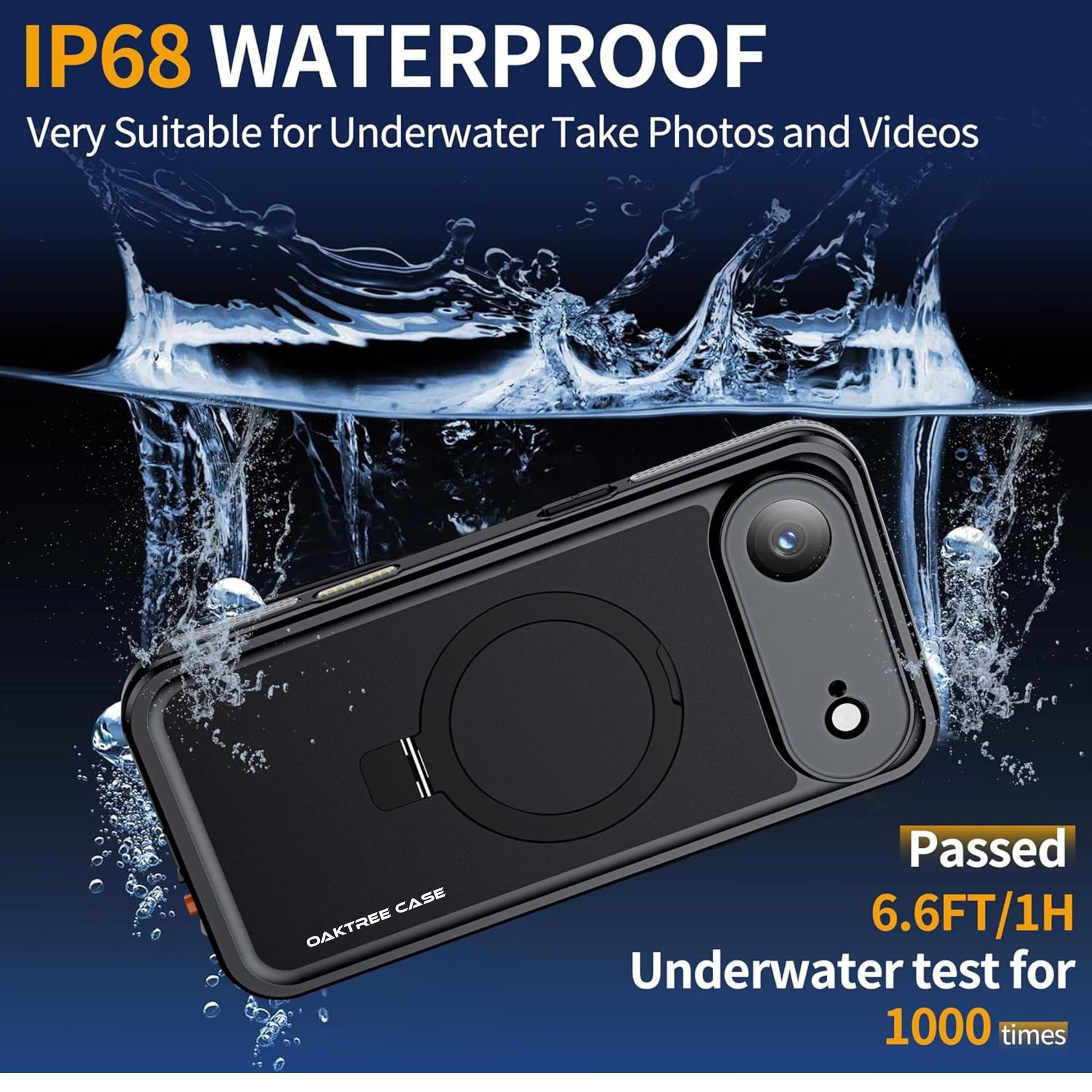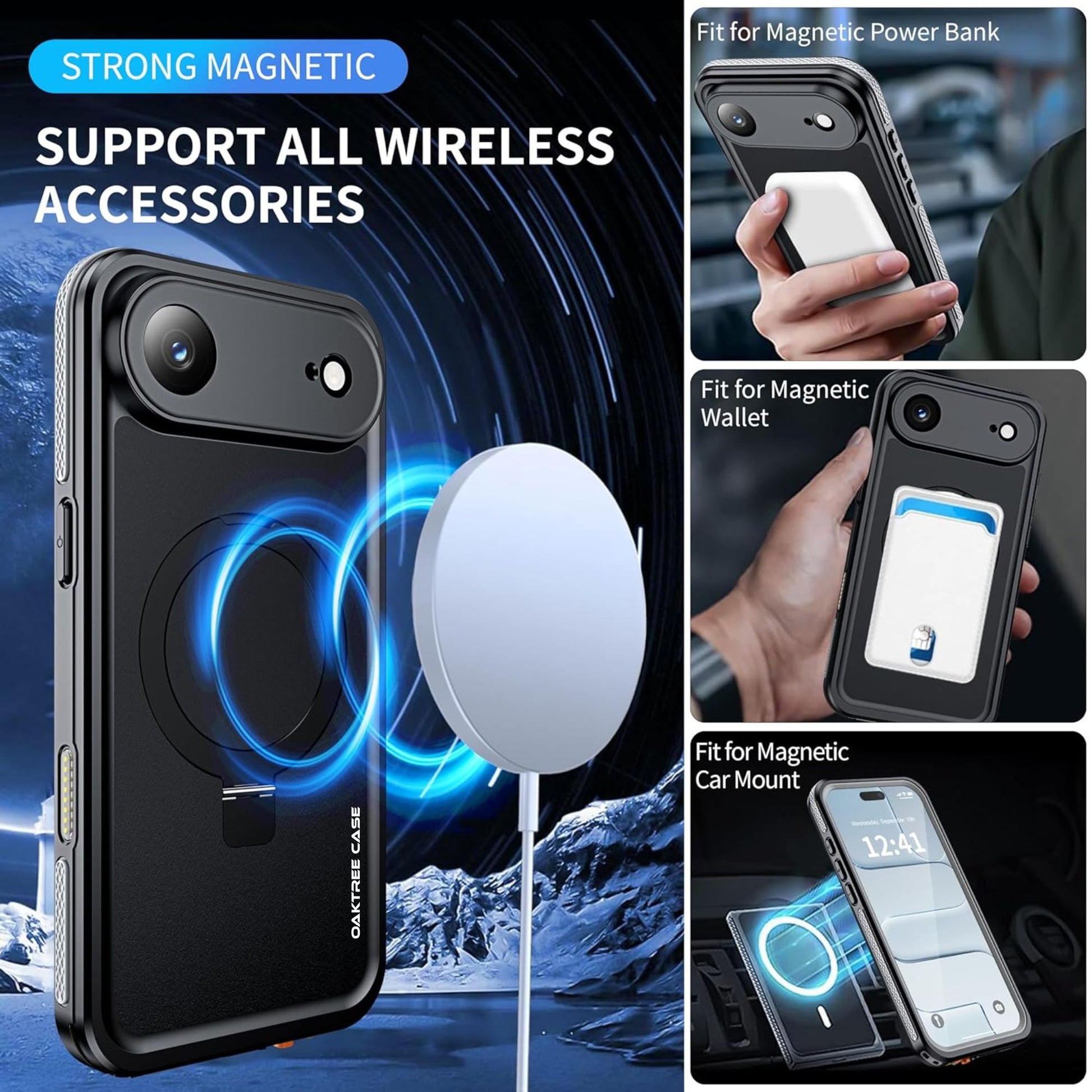 OAKTREE Waterproof MagSafe Case for iPhone 17 Air — 360° Full Protection with Kickstand Ring -Black